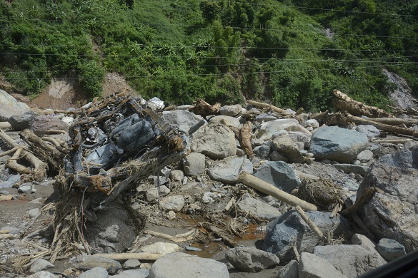 Hình ảnh chiếc xe 4 chỗ còn lại sau trận lũ bên đống đá